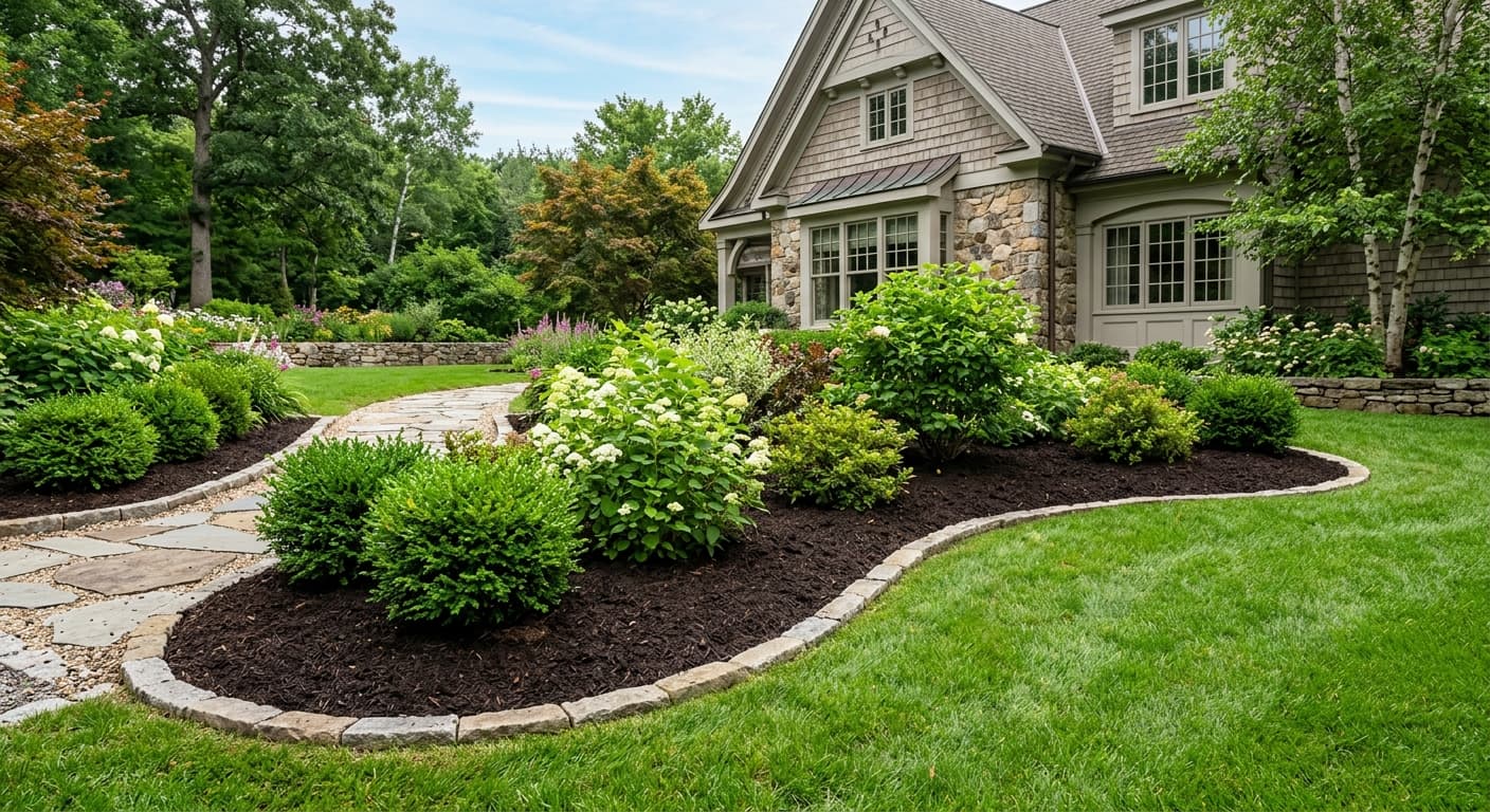 Fresh mulch installed at the correct depth across all beds, properly pulled away from plant trunks and tree bases.